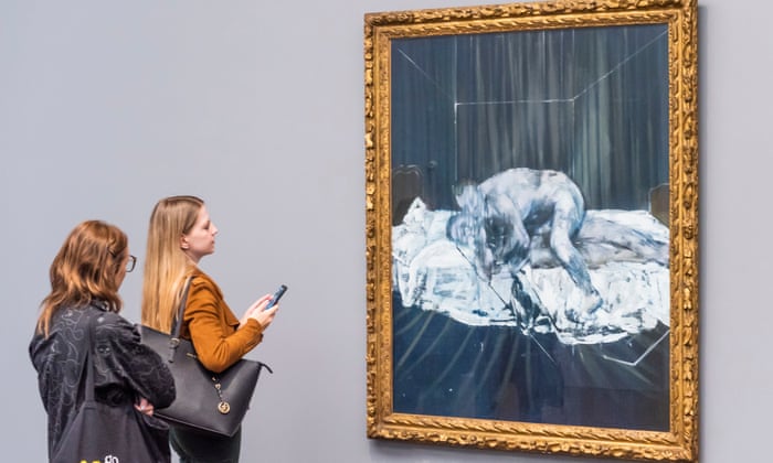 An imaginary curtain gives this painting a chapel-like space. The painting was last exhibited at the Grand Palais in Paris in 1971. Two men make love on a bed that's a sea of crumpled white sheets. As they do it, they look out of the canvas at us - but their faces are distorted, blurred. They might even be grinning at us, gleefully showing off their crime.